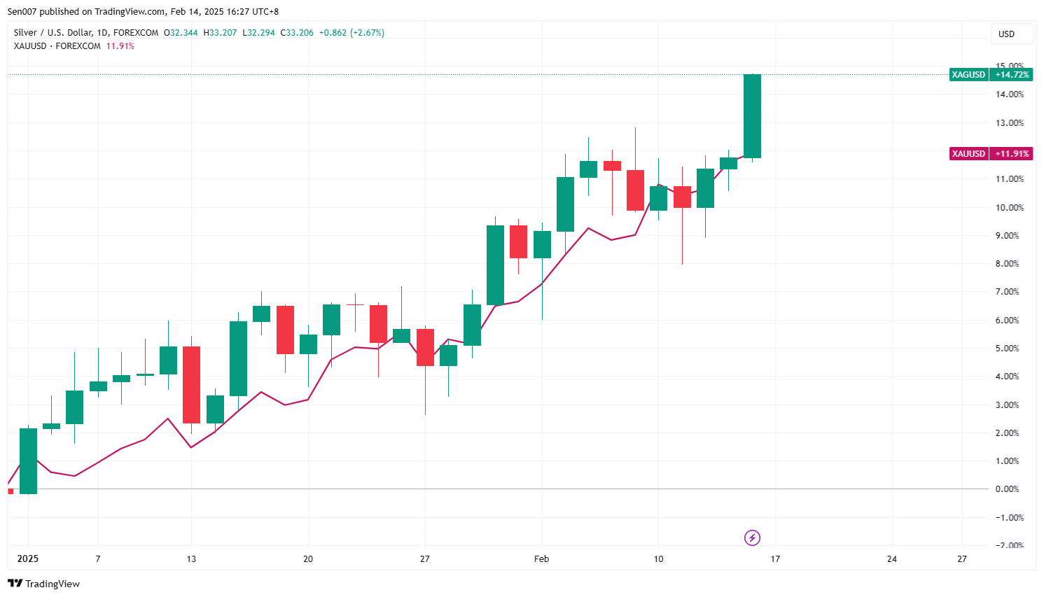 2月14日,白银价格涨超2%,截至发稿报33.18美元/盎司,创去年11月以来新高。