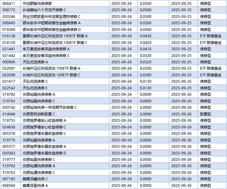 (1)09月24日无新发基金;基金分红95只,多为债券型,派发红利最多的基金是交银施罗德医药创新股票型证券投资基金,每10份基金份额派发红利1.1400元。