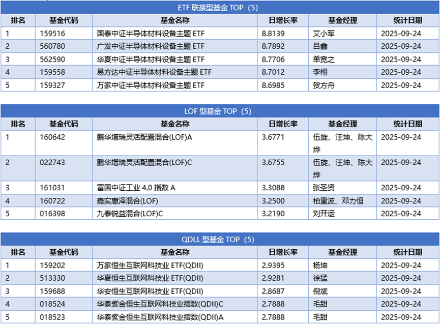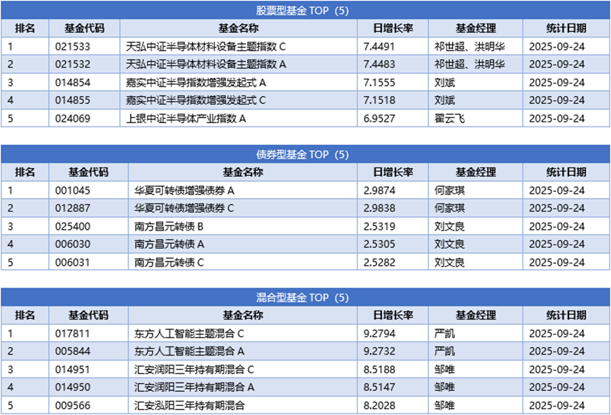 单基金方面,剔除掉 创新封基类型 基金的影响,09月24日业绩表现最好的基金为东方人工智能主题混合C,日增长率为9.2794%,其次为东方人工智能主题混合A,日增长率为9.2732%、国泰中证半导体材料设备主题ETF,日增长率为8.8139%。
