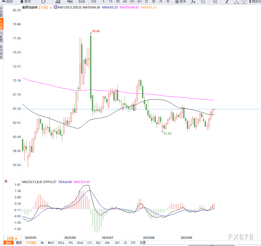 从 美原油(WTI)日线图走势来看,价格已突破前期震荡区间上轨,并稳固站上65美元关口,技术面显示多头动能增强。均线系统形成短期金叉形态,MACD指标上行发散,显示上涨趋势仍在延续。