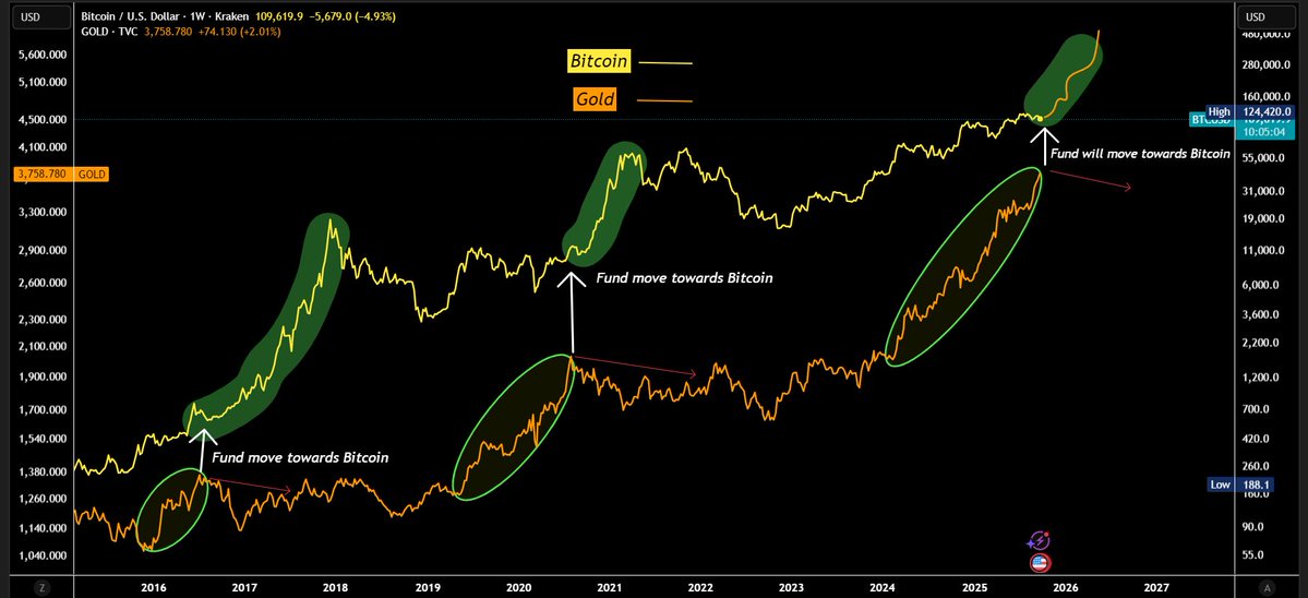 若轮动发生,比特币可能在2025年底挑战20万-25万美元,基于历史涨幅倍数(200-500%)和当前10.5万美元基数。CoinDesk预测,2026年若美联储降息至3%,比特币或超30万。黄金若触顶(4000美元/盎司),资金流出或加速。