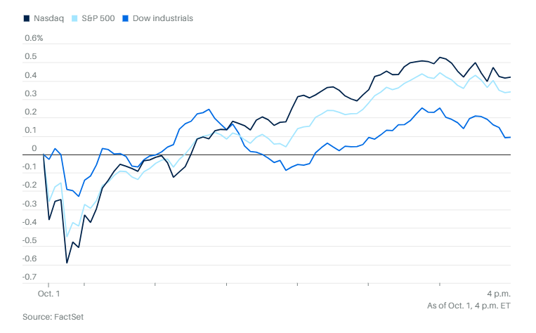 周三,美股再度回到历史高位,投资者对政府关门和疲软的私营部门就业数据几乎毫不在意。标普500指数在低开后反弹0.3%,创下2025年第29个历史收盘新高。道琼斯工业平均指数上涨43点,涨幅0.1%,同样创下新的收盘纪录。纳斯达克综合指数上涨0.4%,重新逼近9月22日的收盘高点。