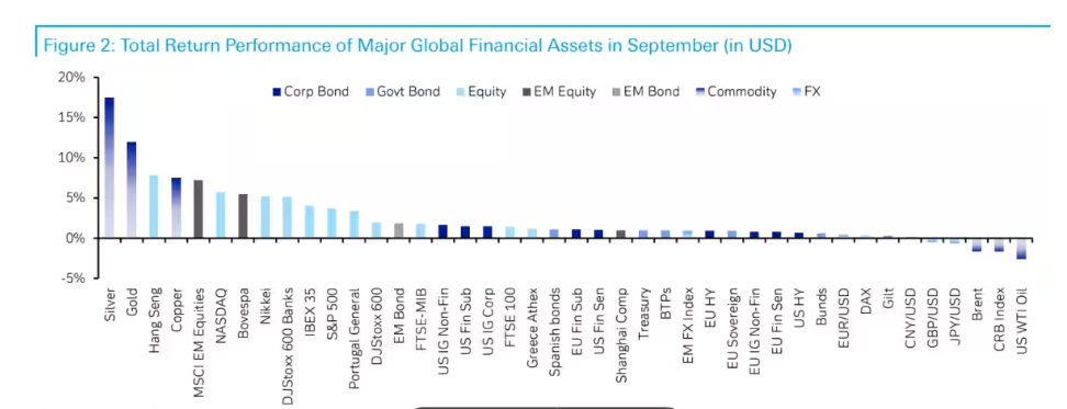 尽管标普500指数9月表现逆季节性走强,录得15年来最大单月涨幅,但从绝对涨幅来看,真正的赢家是贵金属。正如德意志银行提供的图表所示,金属价格大幅领涨。