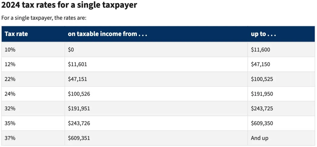 按理说,美国的所得税是累进税,收入越高缴税率也越高。比如,2024 年单一纳税人的联邦所得税税率和税级如下表: