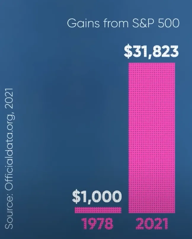 上图是真实数据:如果有人在 1978 年买了 1000 美元标普 500 指数基金,到 2021 年加上收益就是 31823 美元了。