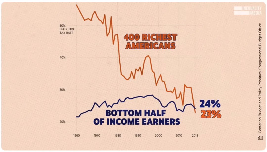 上图是美国最富有的 400 个富豪与底部 50% 纳税人的实际平均税率历史图表(1960-2018)。可以看出,上世纪六七十年代,最富有的 400 名富人的税率远高于底层 50% 纳税人的税率。1980 年是个大转折点,随后的总趋势就是两者越来越接近,直到最后底层的税率终于超过了最富有的人的税率。