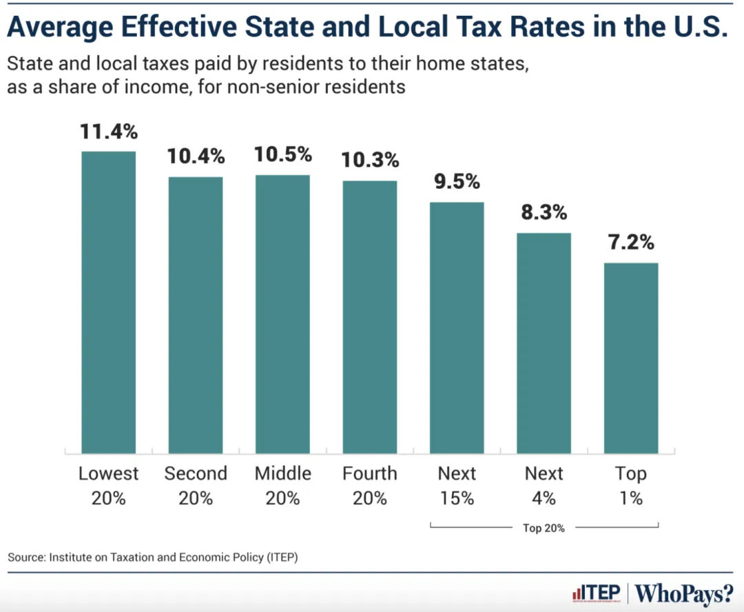 再看看州税的情况。上图是非老年居民州和地方平均实际税率占收入的比例。最左边收入为底层 20% 的人的税率是 11.4%,最右边收入为顶部 1% 的人的税率是 7.2%。自左往右,收入不断增加,税率却在不断降低。