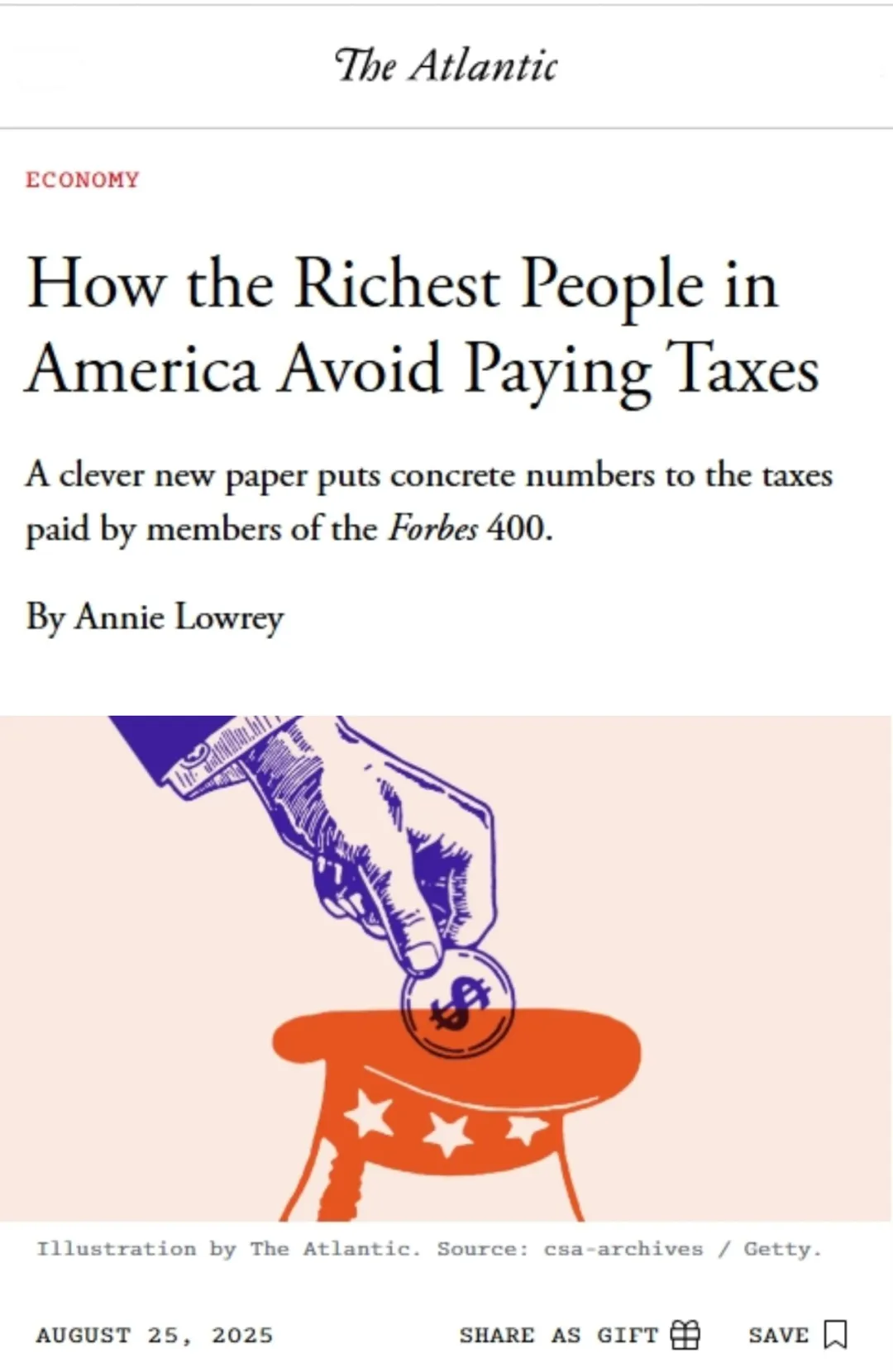 《大西洋月刊》发文(上图,作者安妮·劳瑞[Annie Lowrey])说,这个新研究是一项技术性壮举,它将企业盈利、私人财富和个人纳税额等数据结合在一起。它证实了美国的税法在顶级富豪那里是累退的,而不是累进的。