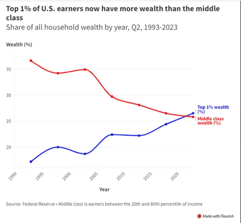 上图是 1993-2023 年按年份分列的美国收入最高的 1% 的家庭与中产阶级家庭的财富份额。这里的中产家庭指收入在第 20 个百分点到第 80 个百分点之间的家庭。图中红线代表收入最高 1% 的家庭,蓝线代表中产阶级家庭。可以看出,现在美国收入最高的 1%的家庭比中产阶级整体拥有更多的财富。