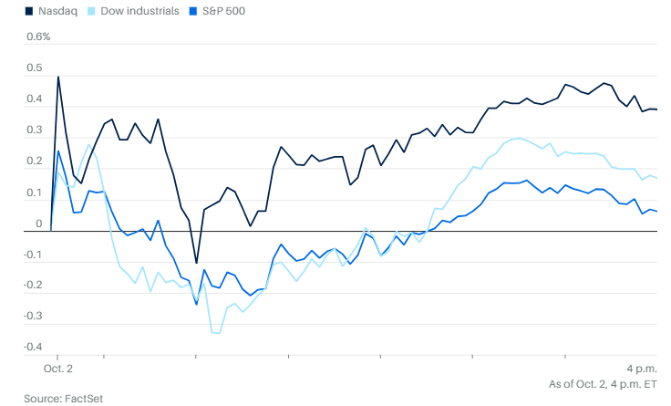 周四随着政府关门进入第二天, 财政部长斯科特·贝森特警告,关门可能“冲击经济增长”。但美国股市再创新高。道琼斯工业平均指数上涨79点,涨幅0.2%。标普500指数上涨0.1%。纳斯达克综合指数上涨0.4%。标普和纳斯达克今年都创下第30次收盘新高,道指则创下第10次。