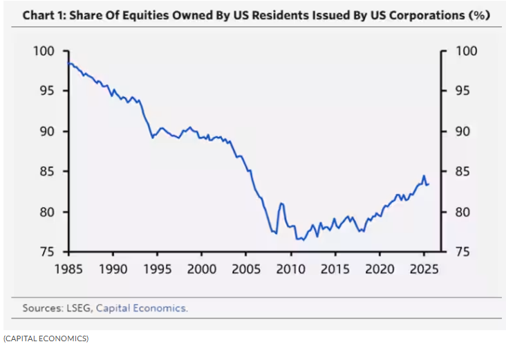 截至第二季度末,美国居民所持有的全部股票中(包括上市公司、非上市公司、ETF、封闭式基金和房地产投资信托,但不包括共同基金),超过83%是由美国公司发行的。而在2010年第四季度,这一比例约为77%。