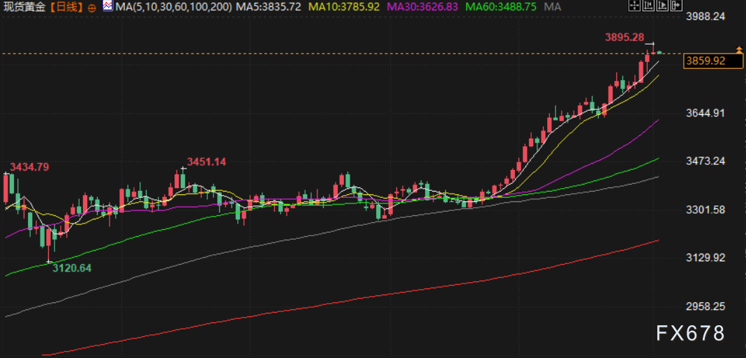 美元/盎司附近,金价周三再度刷新历史新高至3895.28美元/盎司,受美元走软和
