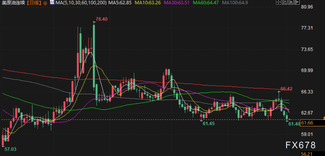 美原油交投于61.70美元/桶附近,油价周三下滑,触及16周低点,因美国政府关门加剧了市场对全球经济的担忧,同时交易商预计随着