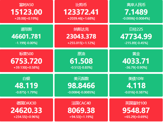 周三,标普500指数、纳指创下收盘新高。截至收盘,道指收平,报46601.78点;纳指涨255.02点,涨幅为1.12%,报23043.38点;标普500指数涨39.13点,涨幅为0.58%,报6753.72点。AMD涨11.3%,创下历史新高,总市值超3800亿美元。英伟达涨2.2%,美光科技涨5.8%。纳斯达克中国金龙指数收涨0.87%,网易涨近3%,蔚来汽车涨4.5%。