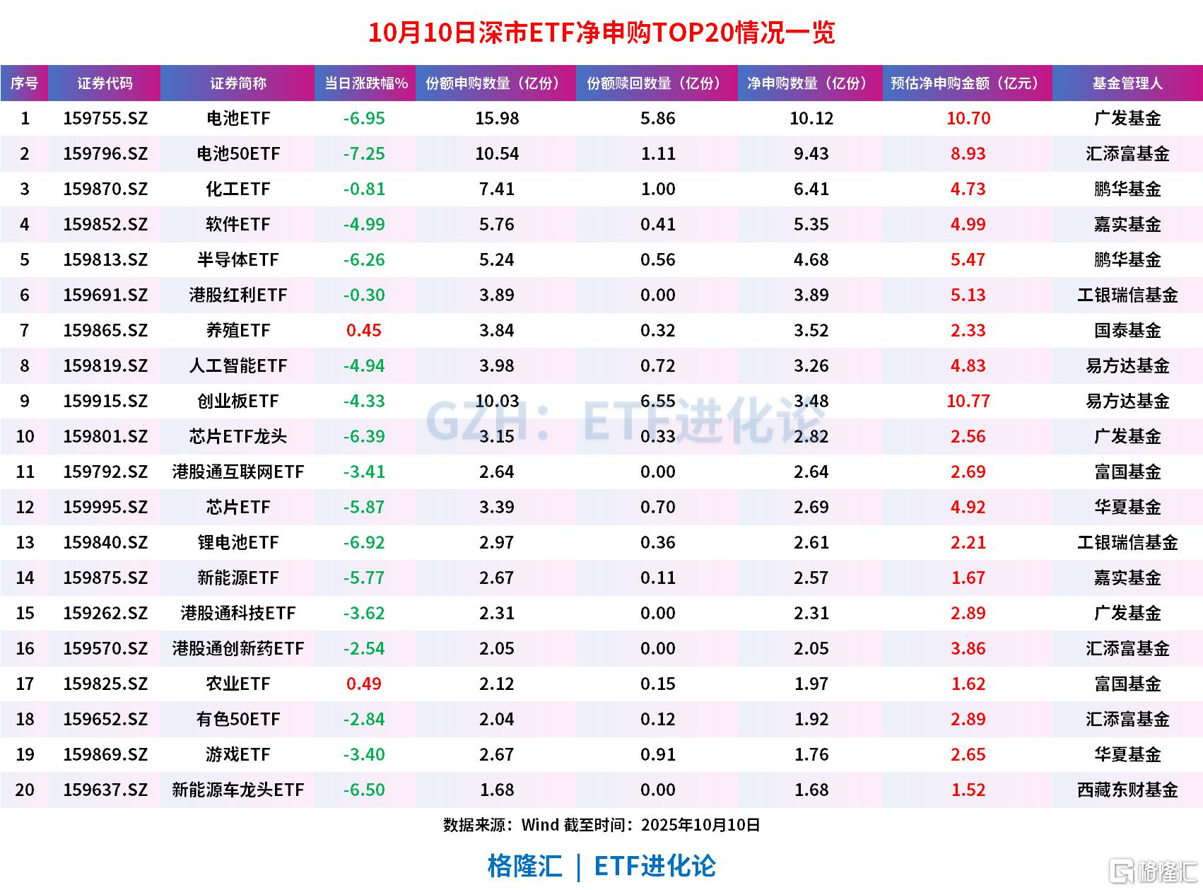 由于在深交所上市的ETF盘中可查阅实时申购、赎回数据,wind数据显示,今日预估合计111.79亿元资金借道深市ETF抄底,其中单日暴跌超6%的广发电池ETF、汇添富电池50ETF分别获资金净申购10.12亿份和9.43亿元,预估净申购额分别是10.7亿元和8.93亿元。