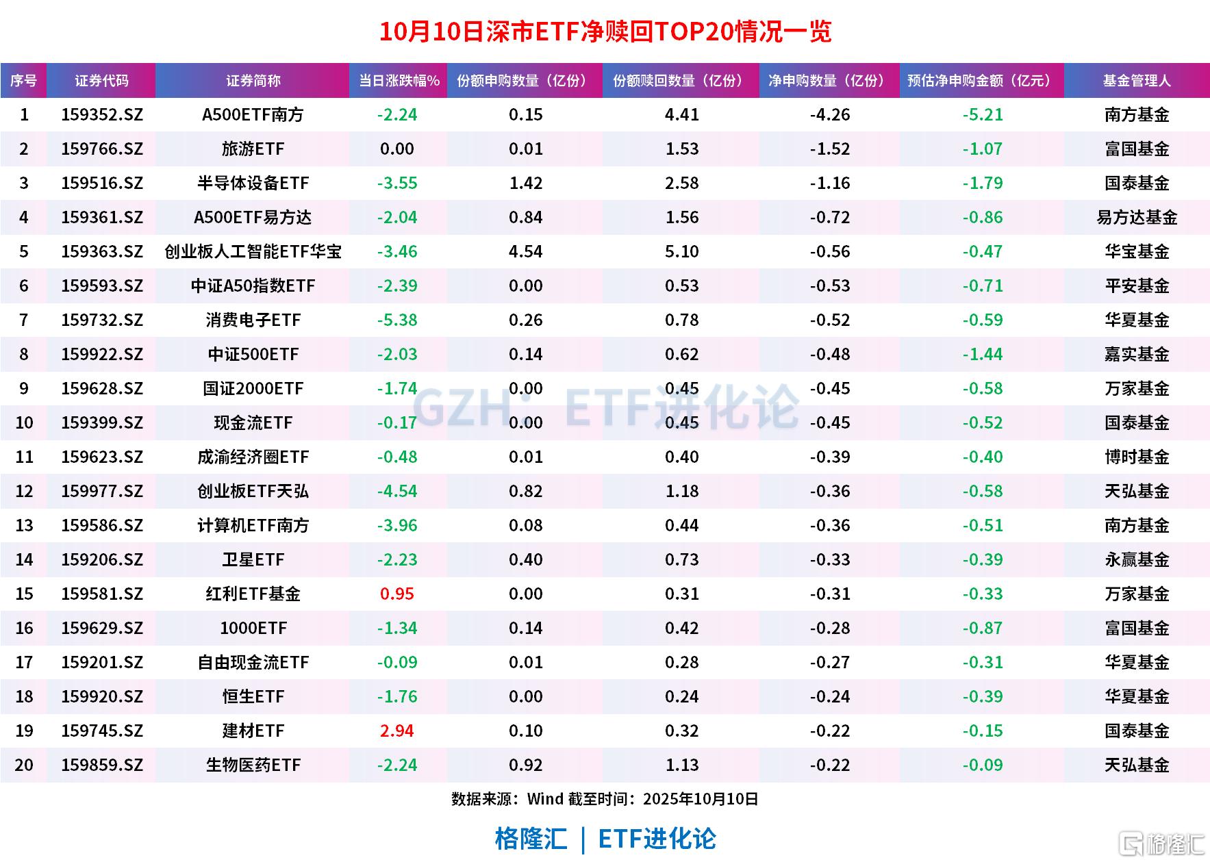 在净赎回方面,A500ETF南方、富国旅游ETF、国泰半导体设备ETF和A500ETF易方达分别净赎回4.26亿份、1.52亿份、1.16亿份、0.72亿份。