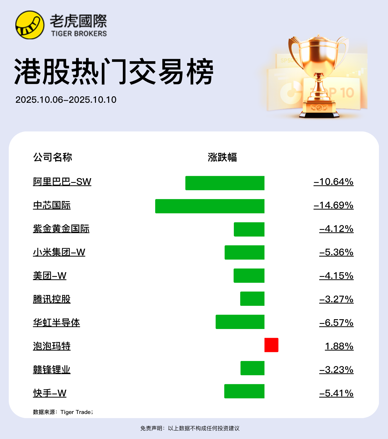 本周老虎用户热门交易个股:Top2:中芯国际,本周,高盛上调中芯国际目标价,由此前的95港币上调至117港币,理由是随着本土AI解决方案的发展,中芯国际有望长期受益。在此利好下,中芯国际本周创下历史新高。但是,因市盈率超300倍,A股中芯国际两融折算率由70%下调至0,引发投资者对半导体高估值的担忧,中芯国际股价大跌;