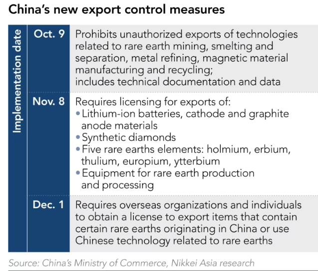 日经亚洲分析说,中国对稀土、锂离子电池及人造钻石实施新的出口管制,震惊了全球各国政府和企业,特朗普也很愤怒,并宣布从11月1日起对中国商品增加百分百的关税。