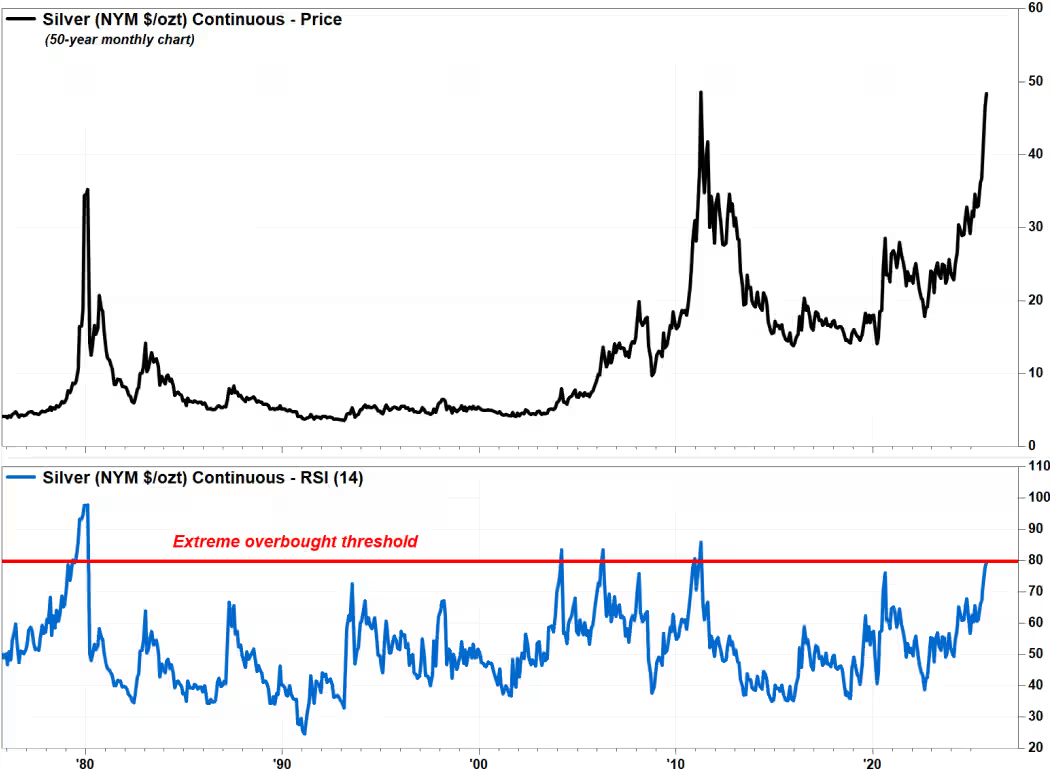 他指出,尽管银期货的相对强弱指数(RSI)——一个广泛关注的动量指标——显示当前银价处于“极度超买区间”,但其数值仍低于1980年和2011年涨幅期间所见的高水平。这意味着,银价仍有进一步上涨的潜力。