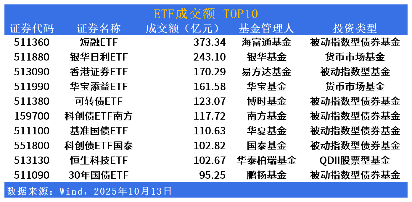 成交额方面,短融ETF(511360)今日成交额居首,达373亿元;银华日利ETF(511880)、香港证券ETF(513090)、华宝添益ETF(511990)成交额紧随其后。