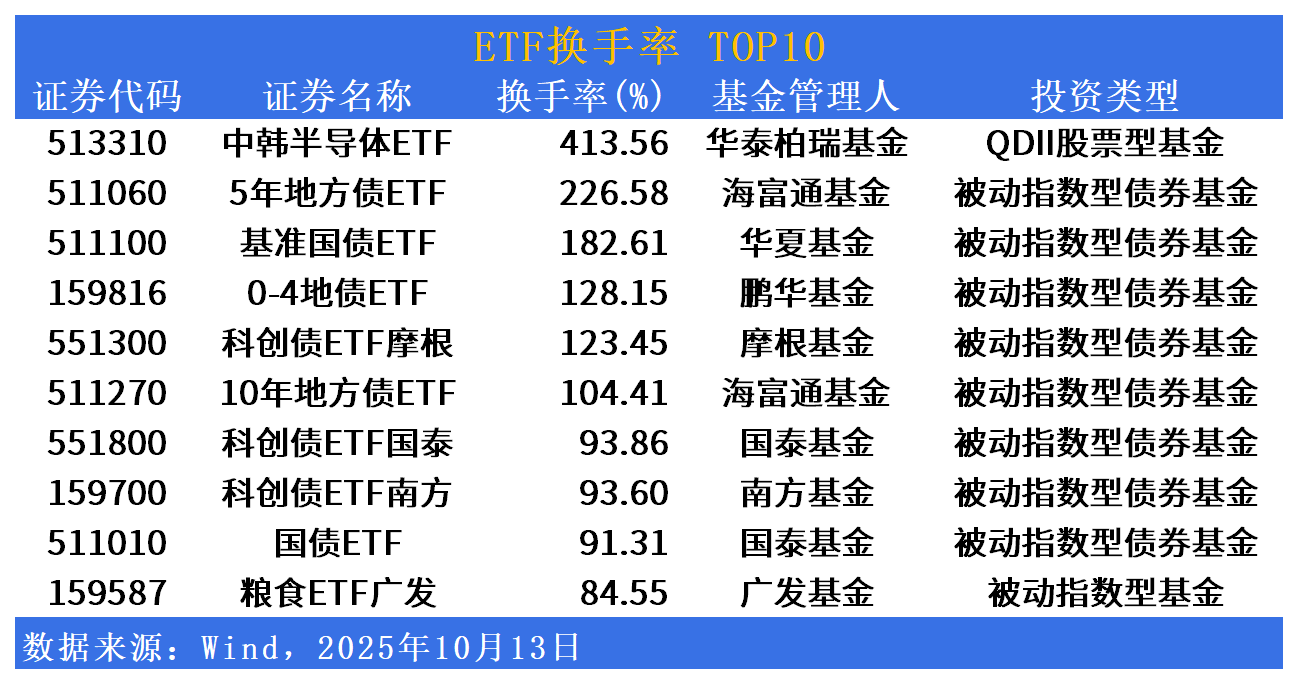 换手率方面,中韩半导体ETF(513310)换手率居首,达413%。5年地方债ETF(511060)、基准国债ETF(511100)、0-4地债ETF(159816)换手率居前。