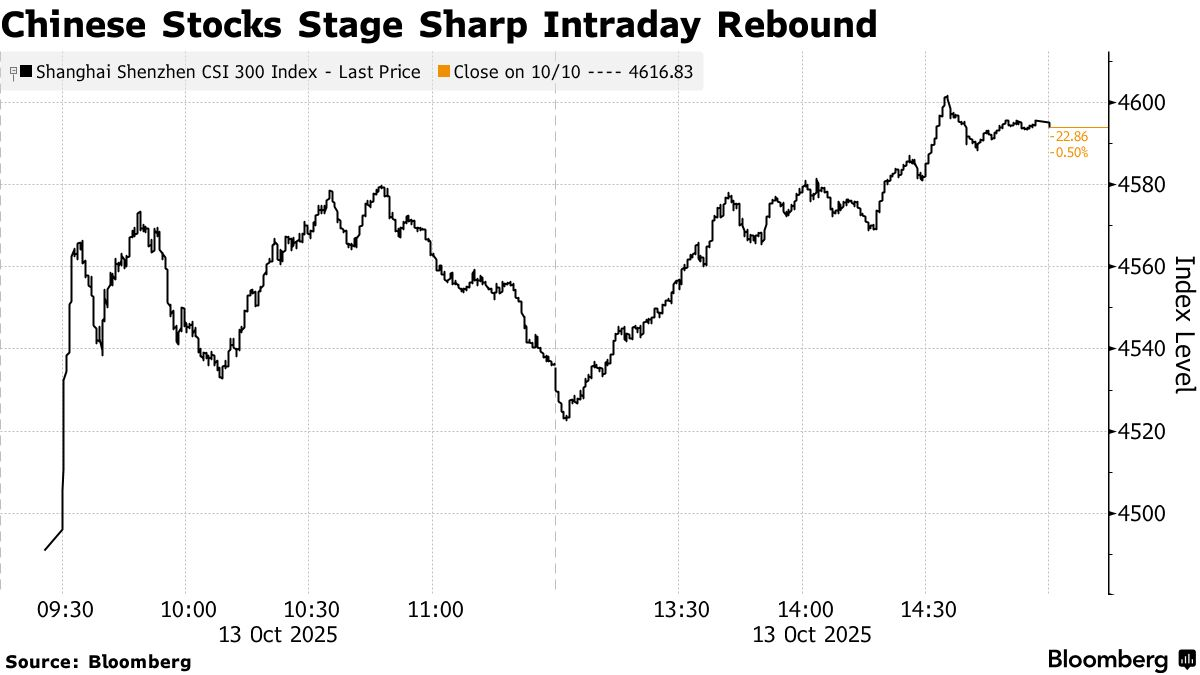 虽然美国总统特朗普提出对中国征收额外100%关税,让人联想起4月时曾令市场陷入恐慌的威胁,但周一(10月13日)沪深300指数仅下跌0.5%。下午的强劲反弹显示,投资者在积极逢低买入。