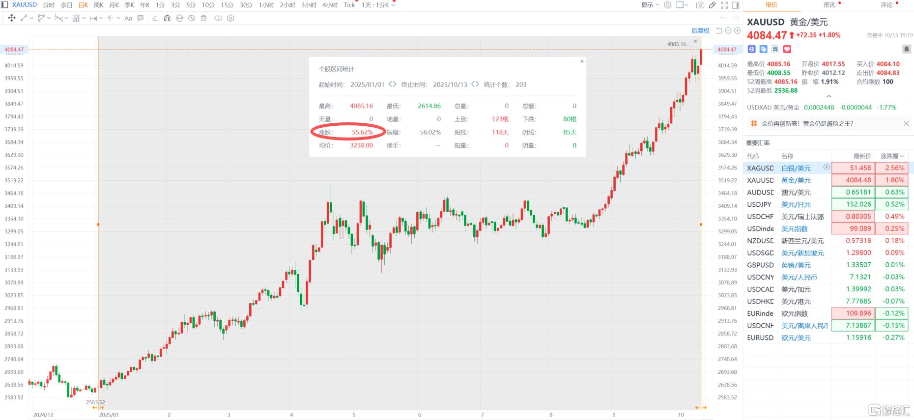 周一,金价再创历史新高。纽约期金一举突破4100美元/盎司关口,日内涨2.49%;现货黄金也升破4080美元/盎司,年内已累涨超55%。