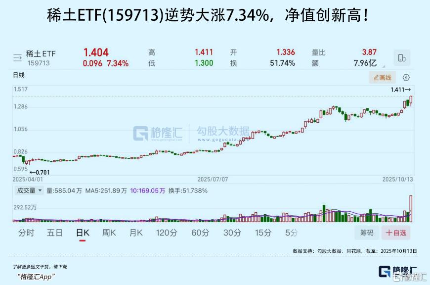 稀土ETF(159713)今日逆势大涨7.34%,金价冲上4070美元/盎司,再创历史新高,金ETF(518680)今日涨2.96%。