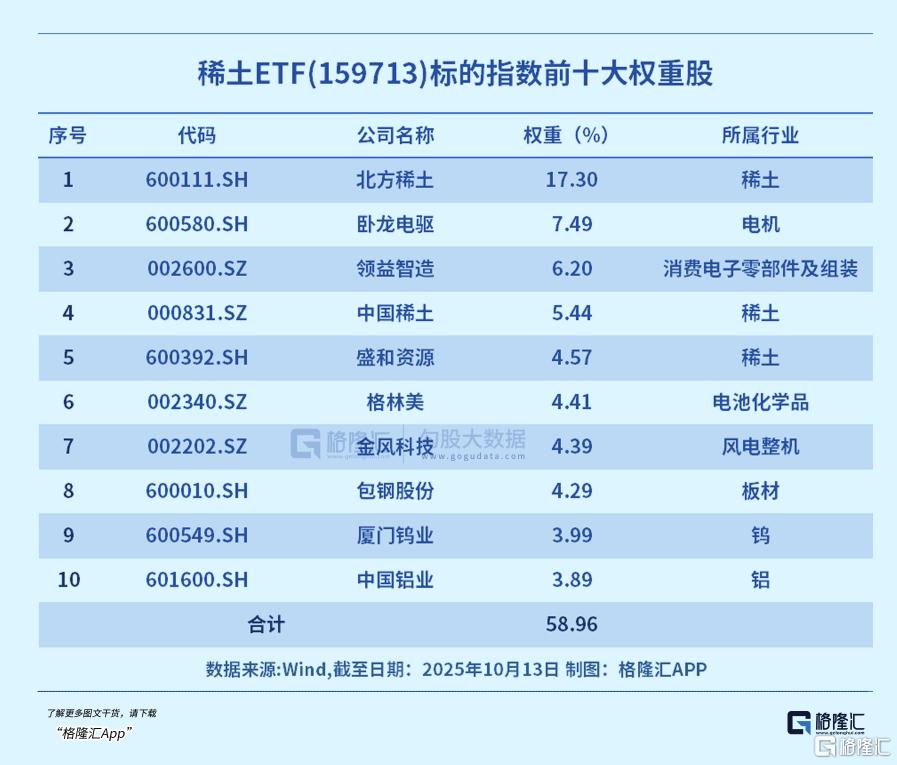 该ETF跟踪的中证稀土产业指数,全面覆盖稀土采掘、冶炼加工及高端应用领域,重点布局稀土、磁性材料、电机等关键环节,聚焦行业龙头与核心技术企业,成份股中北方稀土 中国稀土 包钢股份占比31.6%,能实现一键分享稀土板块的时代红利。