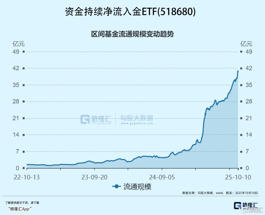 Wind数据显示,截至2025年10月10日,金ETF(518680)近一年净值增长52.07%,在全市场14只黄金ETF中位居Top 1,年内资金净流入25.1亿元,最新规模40.57亿元,位居同标的ETF第一。