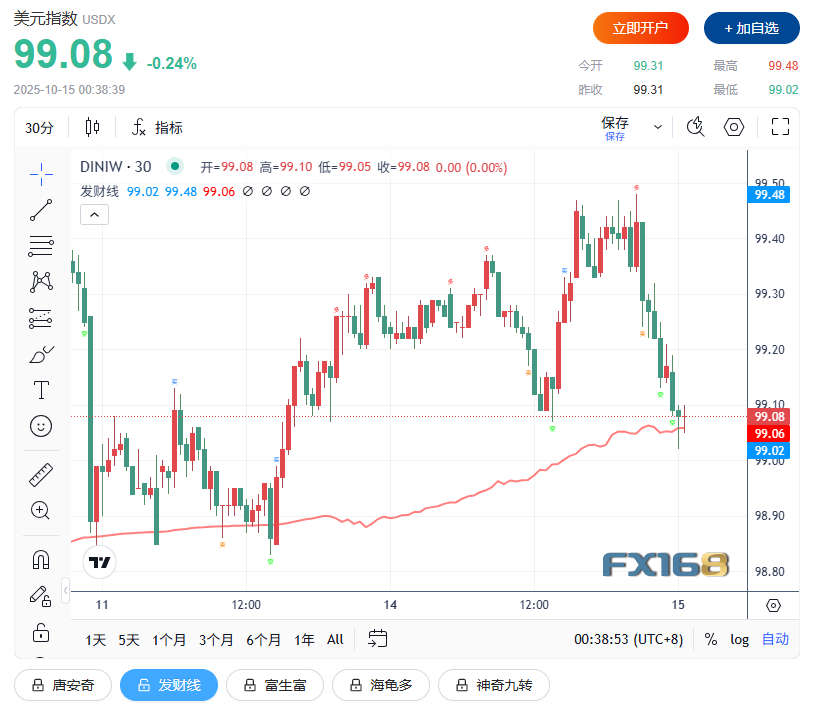 鲍威尔讲话期间,美元指数DXY回落至99下方,日内跌0.27%。