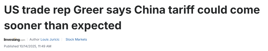 格里尔最新表态:关税或提前实施,仍期待“解局窗口”美国贸易代表贾米森·格里尔(Jamieson Greer)周二在接受 CNBC 采访时表示,总统唐纳德·特朗普可能最早于11月1日对中国商品征收100%关税,时间点“取决于中国的下一步动作”。