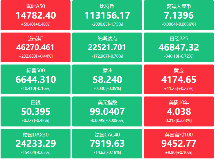 外汇:美元指数下跌0.25%报99.025点,美元兑日元跌0.31%报151.81日元,欧元兑日元持平报176.21日元,英镑兑日元跌0.41%报202.204日元;欧元兑美元涨0.33%,英镑兑美元跌0.10%,美元兑瑞郎跌0.38%,澳元兑美元跌0.44%,纽元兑美元跌0.18%,美元兑加元涨0.07%;离岸人民币兑美元报7.1402元,较周一跌19点;比特币期货跌2.47%至11.4万美元下方,以太币期货跌3.22%报4138.50美元。