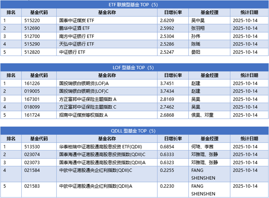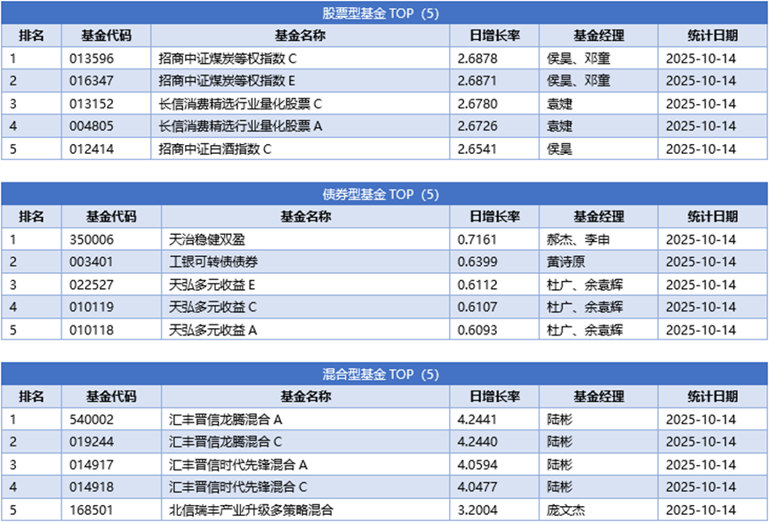 单基金方面,剔除掉 创新封基类型 基金的影响,10月14日业绩表现最好的基金为汇丰晋信龙腾混合A,日增长率为4.2441%,其次为汇丰晋信龙腾混合C,日增长率为4.2440%、汇丰晋信时代先锋混合A,日增长率为4.0594%。