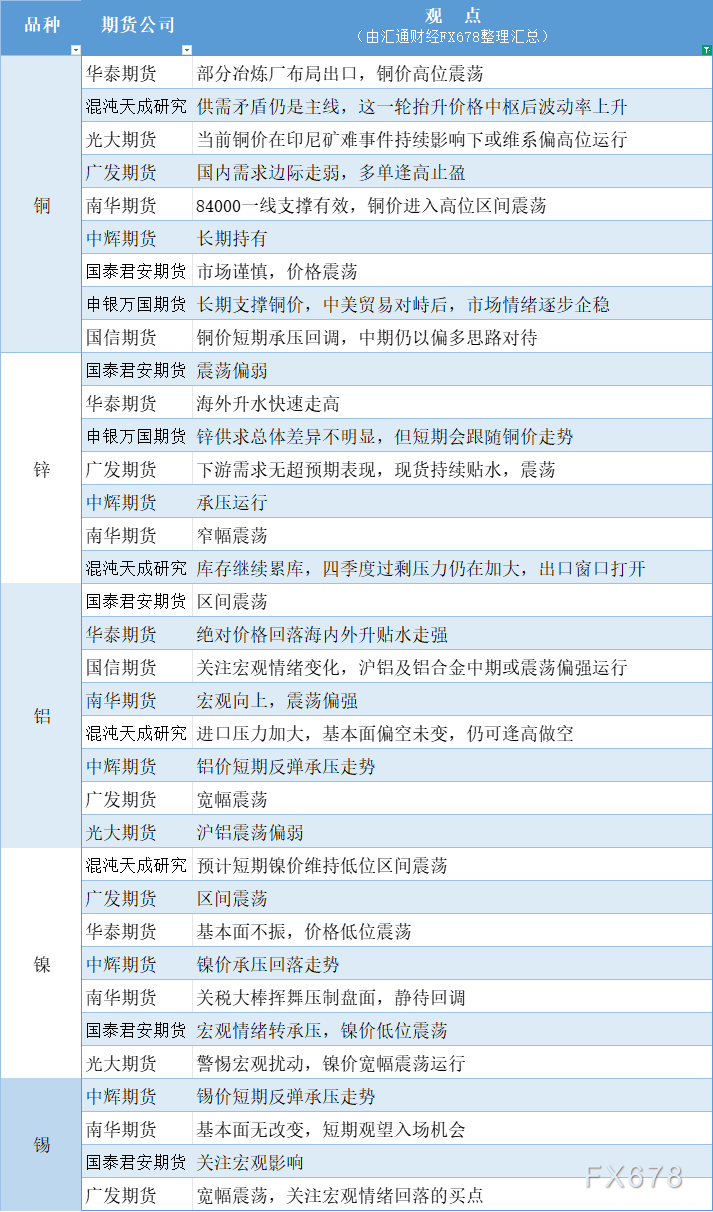 期货公司观点汇总一张图:10月15日有色系(铜、锌、铝、镍、锡等)