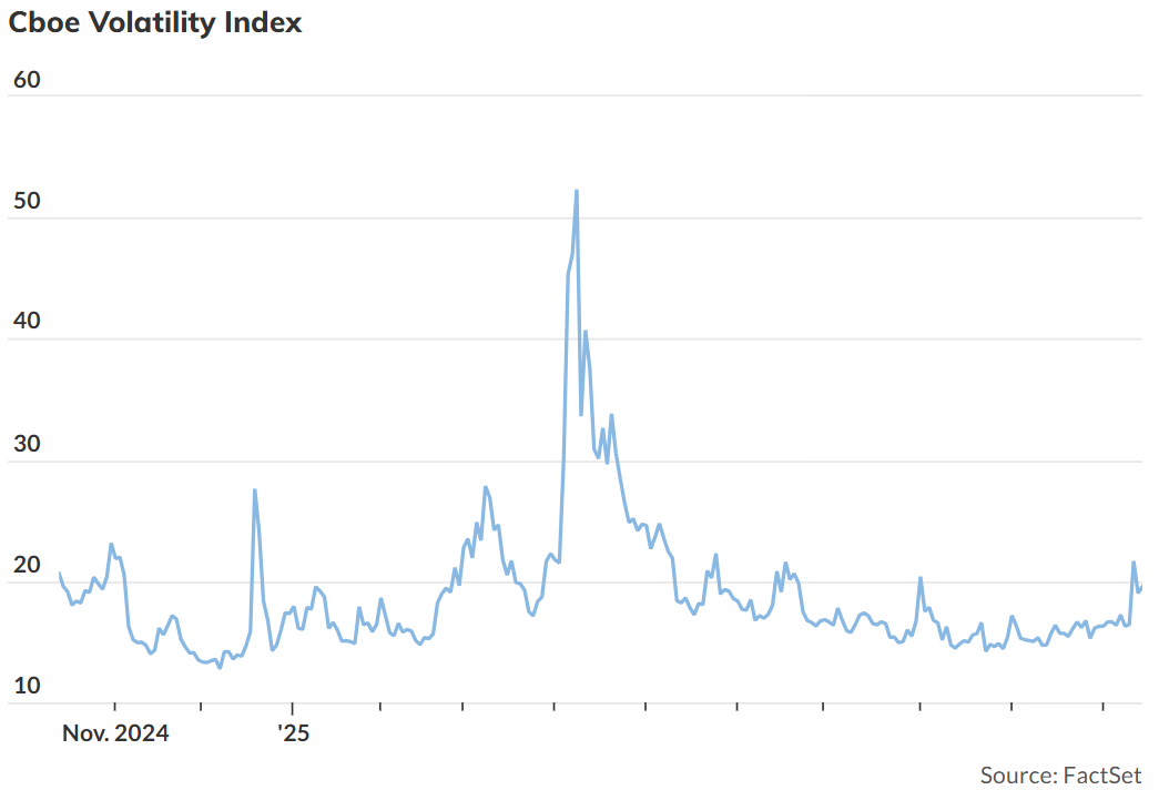 芝加哥期权交易所波动率指数(VIX),即华尔街广为人知的“恐慌指数”,周二(10月14日)盘中一度触及22.76,为5月23日以来的最高盘中水平(当时曾达到25.53)。根据道琼斯市场数据,该指数收盘时虽从高点回落,但仍收于20以上,这一水平具有重要意义。