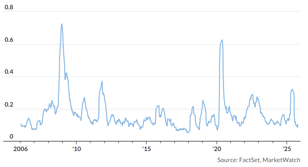 整个夏季,股市几乎毫无波折地持续上涨。这种平静的交易使标普500指数的三个月历史波动率降至2020年1月以来的最低水平。历史波动率是衡量某一资产或指数近期实际波动程度的指标;而VIX衡量的是隐含波动率,即投资者对短期未来市场波动的预期。