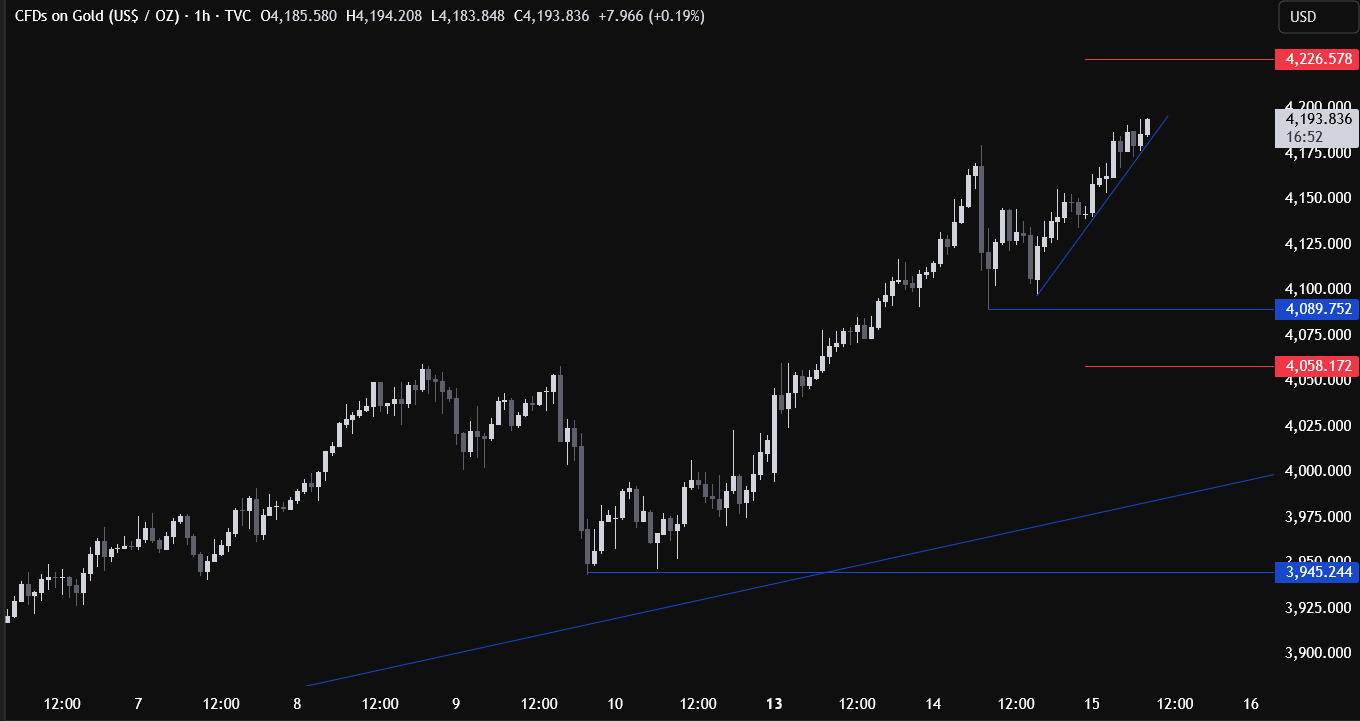 在1小时图上,可以看到一条较小的上升趋势线,同样维持着短线的多头格局。买家预计会继续依托该趋势线推升价格至新高;而空头则希望价格能跌破这条趋势线,从而回调至4,089美元一线——预计这是多头首次逢低买入的潜在位置。图中的红色线条代表当日的平均波动区间。