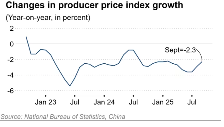 与此同时,消费者价格指数(CPI)同比下降0.3%,虽较8月0.4%的跌幅有所改善,但仍受到猪肉和新鲜蔬菜等食品价格下滑的拖累。环比来看,CPI上涨0.1%。
