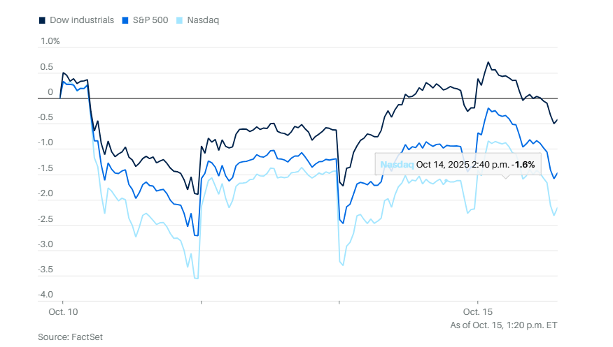 华尔街周三继续上演波动戏,贸易紧张局势、政府关门以及大量企业财报发布撞在一起,争夺投资者的注意力。 主要股指开盘时上涨势头良好,但在交易过程显示后继乏力。标准普尔500指数上涨0.4%。纳斯达克综合指数上涨0.7%。道琼斯工业平均指数下跌17点,跌幅不足0.1%。