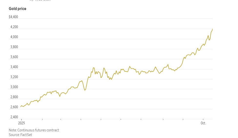 贵金属周三继续上涨,现货黄金上涨1.6%,至每盎司4,209.88美元。最活跃的黄金期货合约创下今年第47次收盘新高,突破了4200美元,当日收于每盎司4201.60美元,年内涨幅已达59%。近月黄金期货合约上涨每盎司38.20美元,涨幅0.9%,至4176.90美元。这一合约已连续四个交易日上涨,在过去19个交易日中有16天上涨。