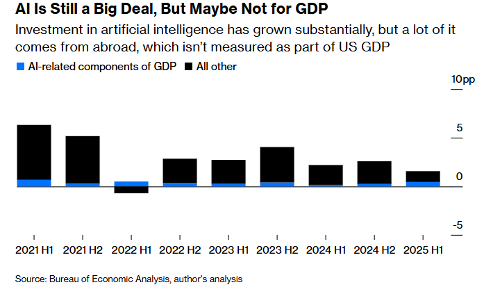 不过,这里有一个关键但容易被忽略的前提:人工智能相关投资中,有相当一部分是通过进口完成的,这意味着AI投资对GDP增长的实际贡献没有表面上看起来那么大(因为GDP衡量的是美国境内生产的总价值)。