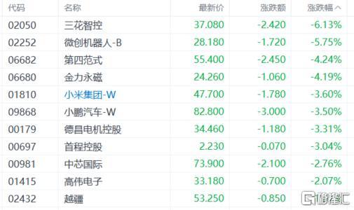 具体来看:权重科技股集体下跌,小米跌3.6%,百度、美团、腾讯控股跌超1%,京东、快手、阿里巴巴微跌,网易微涨。