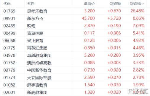 教育板块涨幅居前,思考乐教育涨超26%,新东方涨超8%,卓越教育集团等跟涨。