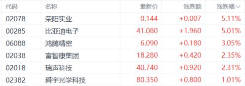 苹果概念股强势,比亚迪电子涨近5%,鸿腾精密、富智康集团、瑞声科技、舜宇光学科技等跟涨。