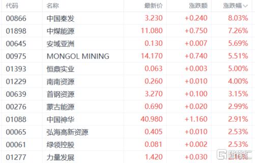 煤炭股走高,中国秦发涨超8%,中煤能源、南南资源、首钢资源等跟涨。