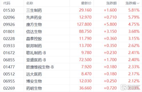 创新药板块上涨,三生制药、先声药业涨近6%,康方生物、信达生物、晶泰控股、联邦制药等跟涨。
