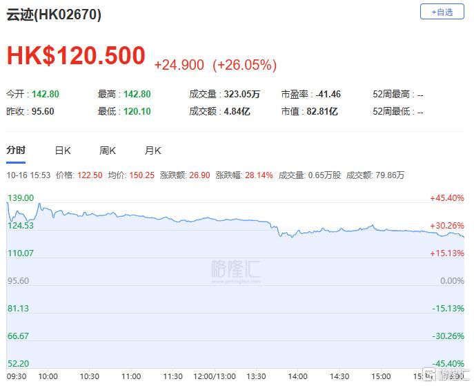 个股方面云迹今日首日在港上市,收涨26.05%,报120.5港元,最新市值82.81亿港元。
