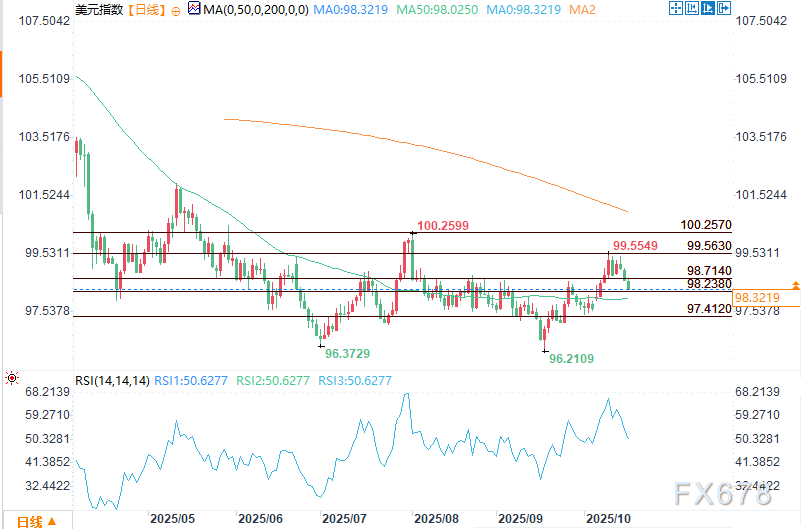 汇通财经APP讯——周四(10月16日)美盘时段, 美元指数小幅下跌,跌破98.714这一关键水平,该水平目前已转化为阻力位。下一个重要支撑位为98.238,再往下则是50日均线所在的98.033——若跌破这一关键水平,可能引发更大幅度的市场波动。