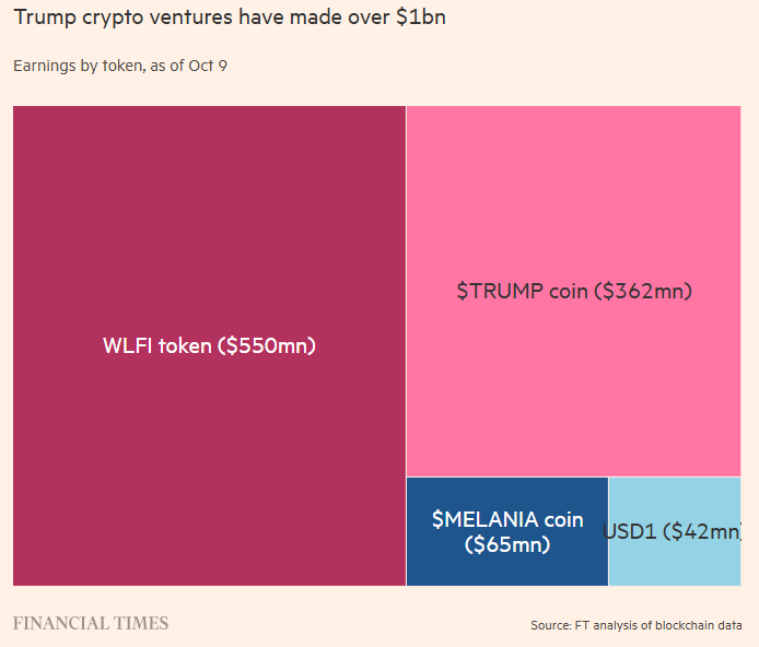 据《金融时报》估算,WLFI代币的销售收入达5.5亿美元。USD1稳定币的销售额为27.1亿美元。